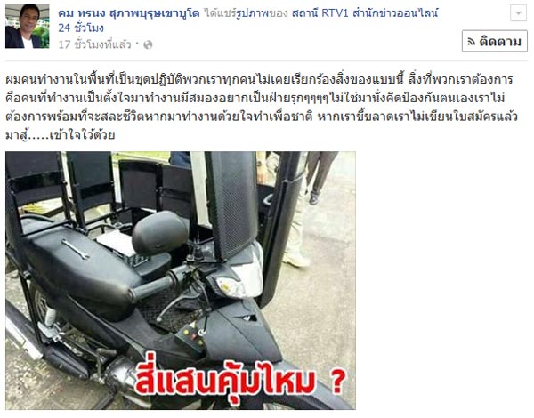 นอกจากนี้ ผู้ใช้บัญชี เฟซบุ๊ก คม ทรนง สุภาพบุรุษเขาบูโด ได้แสดงความเห็นที่มีต่อภาพดังกล่าวว่า...