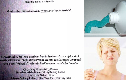 หลังจากที่มีการแพร่กระจายในโซเชียลมีเดียว่า โรงพยาบาลบำรุงราษฎร์ เผยแพร่ข่าวว่า อเมริกาประกาศเรื่องสารก่อมะเร็ง 'ไตรโคลซาน' ในผลิตภัณฑ์ ยาสีฟัน น้ำยาบ้วนปาก โฟมล้างหน้า สบู่ แป้งเย็น สบู่เหลวล้างหน้าและโฟมล้างหน้าชื่อดังหลายยี่ห้อในตลาด ว่าจากการวิจัยที่พบในอังกฤษ สารที่ผสมในผลิตภัณฑ์เหล่านี้จะทำปฏิกริยากับน้ำคลอรีน (น้ำประปาที่ใช้อยู่) เกิดเป็นก๊าซคลอโรฟอร์ม และเมื่อร่างกายได้รับก๊าซนี้มากๆ จะทำให้ป่วยเป็นโรคซึมเศร้า โรคตับและอาจรุนแรงถึงขั้นเป็นมะเร็ง จึงมีการป ................... อ่านต่อคลิ๊กที่นี่ ไม่แสดงโฆษณา detail (เนื้อหานี้ จะลบตัวเองภายใน 24 ชม. หากใครต้องการอ่านเนื้อหาจะลิงค์ไปยังที่มาต้นฉบับ)