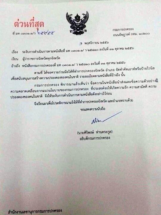 "ตามที่ได้ขอความร่วมมือให้ที่ทำการปกครองจังหวัด อำเภอ จัดทำคัทเอาท์หรือป้ายไวนิลเพื่อสนับสนุนสร้างความปรองดองของคนในชาติ รายละเอียดตามหนังสือที่อ้างถึงนั้น