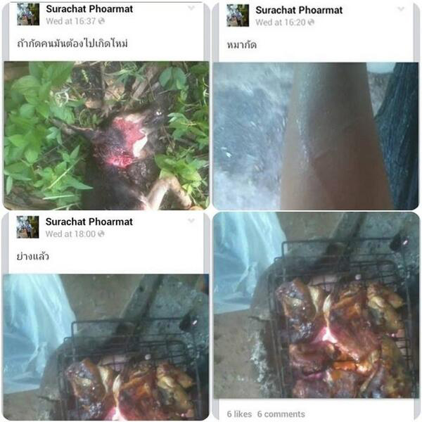 ถูกแชร์อย่างกว้างขวาง สำหรับภาพของชิ้นส่วนสุนัข ซึ่งถูกชายใจร้ายนำไปฆ่า ก่อนที่จะหั่นเป็นชิ้น ๆ แล้วนำไปย่างบนเตาจนไหม้เกรียม ซึ่งชาวเน็ตที่เห็นภาพต่างรุมประณามพฤติกรรมอันสุดแสนจะทารุณของชายคนนี้