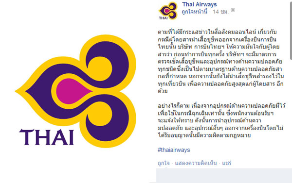การบินไทย โพสต์แจงกรณีสาวขโมยชูชีพ ระบุตรวจสอบอุปกรณ์ทุกครั้งก่อนบินและมีชูชีพสำรองทุกเที่ยวบิน ชี้การขโมยสิ่งของออกจากเครื่องบิน มีความผิดตามกฎหมาย