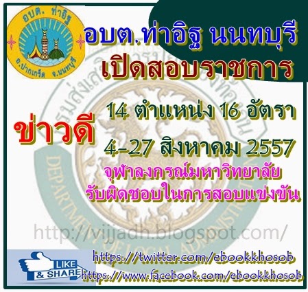 ประกาศองค์การบริหารส่วนตำบลท่าอิฐ (อบต.ท่าอิฐ) จังหวัดนนทบุรี เปิดสอบบรรจุ 14 ตำแหน่ง 16 อัตรา รับสมัคร 4-27 สิงหาคม 2557 จุฬาลงกรณ์มหาวิทยาลัยรับผิดชอบในการสอบแข่งขัน