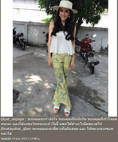 อย่างไรก็ตาม ล่าสุด ช่วงเย็นวันเดียวกัน สาวแพทก็ออกมาโพสต์ขอโทษแล้วว่า... "ถ้าวันนี้แพทอุทานไม่น่ารัก ต้องขอโทษด้วยนะคะ ตกส้นสูงค่ะ"