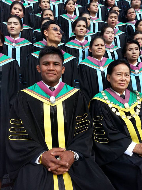 วันนี้ (21 ตุลาคม 2557) เฟซบุ๊ก Banchamek Gym ได้มีการภาพแสดงความยินดีกับบัณฑิตปริญญาเอก บัวขาว บัญชาเมฆ หรือ ดร.สมบัติ บัญชาเมฆ ที่ มาร่วมซ้อมใหญ่พิธีรับพระราชทานปริญญาปรัชญาดุษฎีบัณฑิตกิตติมศักดิ์ สาขาวิชายุทธศาสตร์ การพัฒนาภูมิภาค (กลุ่มการศึกษาและจัดการภูมิปัญญา) มหาวิทยาลัยราชภัฏสุรินทร์ โดยมีครอบครัวมาร่วมถ่ายภาพเป็นที่ระลึก ก่อนจะเข้ารับพระราชทานปริญญาบัตร ในวันศุกร์ที่ 24 ตุลาคม 2557 ที่จังหวัดสกลนคร
