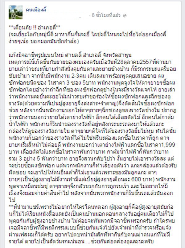 | • **เตือนภัย !! อำเภอลี้ แกงค์หากินง่าย กับแฟ๊บ แลกของรางวัล ข่มขู่เอาเงินคนแก่ |