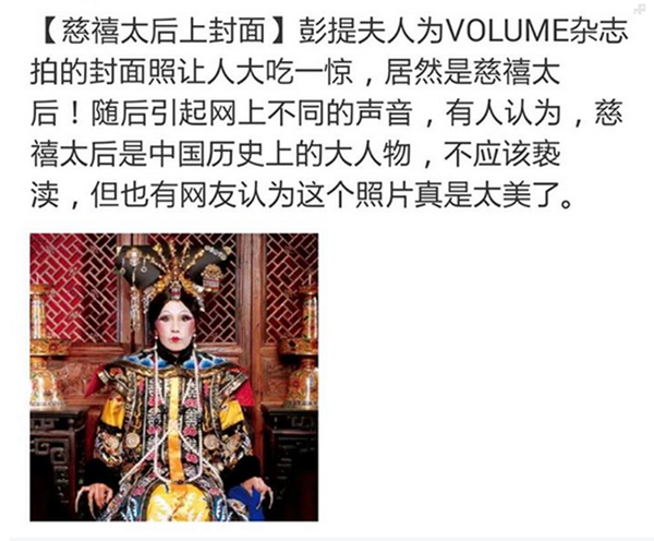 หลังจากเป็นที่ฮือฮาในโลกโซเชียลบ้านเราไปแล้ว ล่าสุดภาพแฟชั่นในมาดพระนางซูสีไทเฮาแห่งราชวงศ์จีน ของแพทย์หญิง คุณหญิงพรทิพย์ โรจนสุนันท์ ที่เคยตีพิมพ์มาแล้วและเตรียมจะถูกนำมาลงใน นิตยสาร Volume ฉบับฉลองครบรอบเล่มที่ 200 ที่จะวางเเผงในเร็ว ๆ นี้นั้น ก็ได้ถูกแชร์ไปถึงเว็บโซเชียลยอดฮิตอย่างเว่ยป๋อของจีนเลยทีเดียว