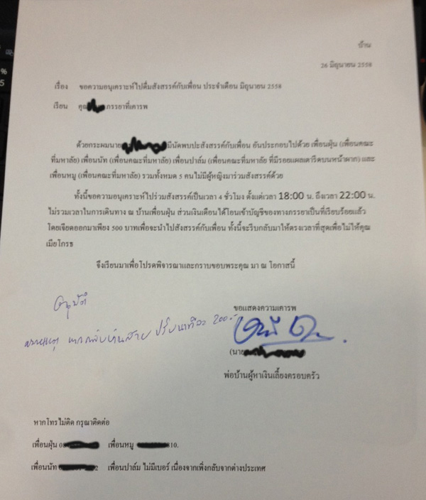 จดหมาย ขออนุญาติเมียไปสังสรรค์กับเพื่อน