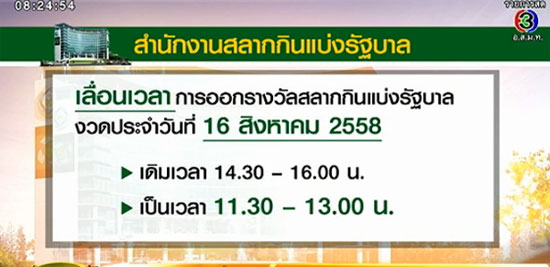 วันนี้ (28 กรกฎาคม 2558) รายการเรื่องเล่าเช้านี้ ช่อง 3 นำเสนอข่าวว่า สำนักงานสลากกินแบ่งรัฐบาล แจ้งเลื่อนเวลาในการออกรางวัลสลากกินแบ่งรัฐบาล งวดประจำวันที่ 16 สิงหาคม 2558 จากเดิมเวลา 14.30-16.00 น. เป็นเวลา 11.30-13.00 น. เนื่องจากตรงกับการจัดกิจกรรม Bike For Mom ปั่นเพื่อแม่ ซึ่งจะจัดขึ้นพร้อมกันทั่วประเทศในเวลา 15.00 น.