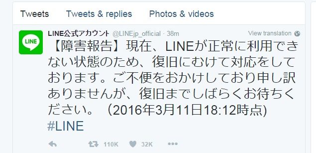 วันนี้ (11 มีนาคม 2559) ทวิตเตอร์ @KAO_VoiceTV21 มีรายงานว่า เมื่อเวลาประมาณ 15.45 น. ที่ผ่านมา ได้มีผู้ใช้งานแอพลิเคชั่น ไลน์ (LINE) ประสบปัญหาไม่สามารถส่งข้อความได้ อย่างไรก็ตามทราบว่าปัญหาดังกล่าวเกิดขึ้นกับผู้ใช้งานเพียงบางกลุ่มเท่านั้น แต่ยังมีบางส่วนที่ยังสามารถส่งข้อความได้ตามปกติ