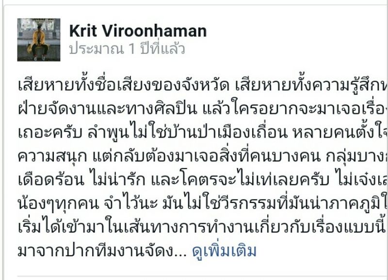 "เสียหายทั้งชื่อเสียงของจังหวัด เสียหายทั้งความรู้สึกทุกฝ่าย โดยเฉพาะฝ่ายจัดงานและทางศิลปิน แล้วใครอยากจะมาเจอเรื่องแย่ๆแบบนี้อีก หยุดเถอะครับ ลำพูนไม่ใช่บ้านป่าเมืองเถื่อน หลายคนตั้งใจมาหาความสุข ความสนุก แต่กลับต้องมาเจอสิ่งที่คนบางคน กลุ่มบางกลุ่มสร้างความเดือดร้อน ไม่น่ารัก และโคตรจะไม่เท่เลยครับ ไม่เจ๋งเลยสักนิด วัยรุ่นและน้องๆทุกคน จำไว้นะ มันไม่ใช่วีรกรรมที่มันน่าภาคภูมิใจเอาซะเลย พอผมเริ่มได้เข้ามาในเส้นทางการทำงานเกี่ยวกับเรื่องแบบนี้ ผมก็พอได้ยินออกมาจากปากทีมงานจัดงานคอนเสิร์ต หรือพี่ๆศิลปินบางส่วน เค้าจะถามผมเสมอว่าลำพูนยังเป็นแบบเมื่อก่อนอยู่ไหม ตีกัน ขว้างระเบิด ฟันกัน กลายเป็นเรื่องปกติเวลามีงานที่ลำพูน มันแย่นะครับที่ได้ยินแบบนั้น ขอร้องนะครับ ขอร้องจริงๆ เปลี่ยนให้เค้ามองลำพูนในมุมใหม่กันเถอะ สิ่งที่พวกคุณกำลังทำเนี่ย มันจะเท่และดูเจ๋งได้ต่อเมื่อมันอยู่บนสังเวียน อยู่ในความถูกต้อง อยู่ในกฎกติกา นั่นแหละเท่ แต่สิ่งที่มันเกิดขึ้น เค้าเรียกกระจอก ไม่แมนสักนิดเลยวัยรุ่น เอาใหม่นะ เพื่อสังคมที่ดีขึ้นของลำพูน."
