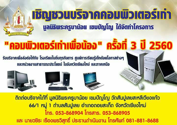 มูลนิธิพระครูบาน้อย เขมปัญโญ ขอรับบริจาคเครื่องคอมพิวเตอร์เก่า จากหน่วยงานราชการ รัฐวิสาหกิจ บริษัท ห้างร้าน และบุคคลทั่วไป ที่ทำการปรับเปลี่ยนระบบคอมพิวเตอร์ใหม่ และไม่ใช้เครื่องคอมพิวเตอร์เก่า นำมาซ่อมบำรุงปรับปรุงให้ใช้งานได้เป็นปกติ เพื่อส่งมอบให้กับ โรงเรียนในถิ่นทุรกันดาร ศูนย์การเรียนรู้เด็กด้อยโอกาสต่างๆ และหน่วยงานสาธารณะประโยชน์ ในจังหวัดเชียงใหม่ และภาคเหนือ