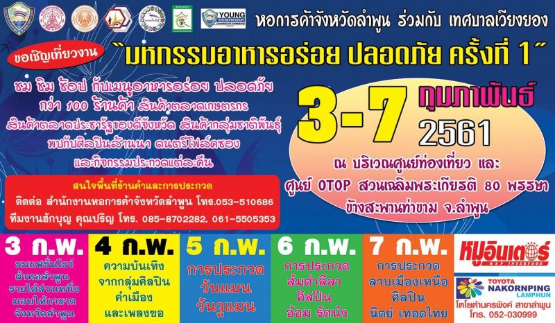 งานมหกรรมอาหารอร่อย ปลอดภัย ครั้งที่ 1 จังหวัดลำพูน ร่วมกับ หอการค้าจังหวัดลำพูน เทศบาลตำบลเวียงยอง และภาคส่วนที่เกี่ยวข้อง กำหนดจัดงานระหว่างวันที่ 3-7 ก.พ. 61 นี้ บริเวณลานหน้าศูนย์บริการนักเที่ยวเชิงสะพานท่าขาม ข้ามฝั่งมาถึงศูนย์เฉลิมพระเกียรติ 80 พรรษา ตำบลเวียงยอง อำเภอเมืองลำพูน จังหวัดลำพูน