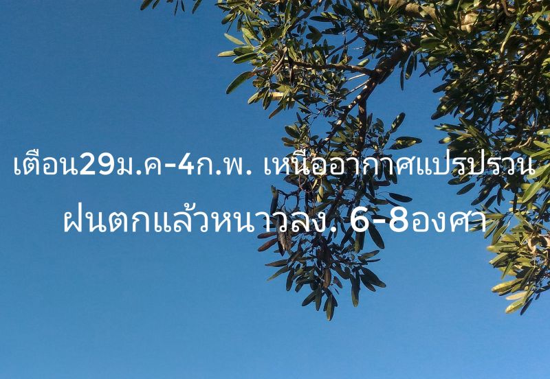 | • เตือน29ม.ค-4ก.พ. เหนืออากาศแปรปรวน ฝนตกแล้วหนาวลง. 6-8องศา |