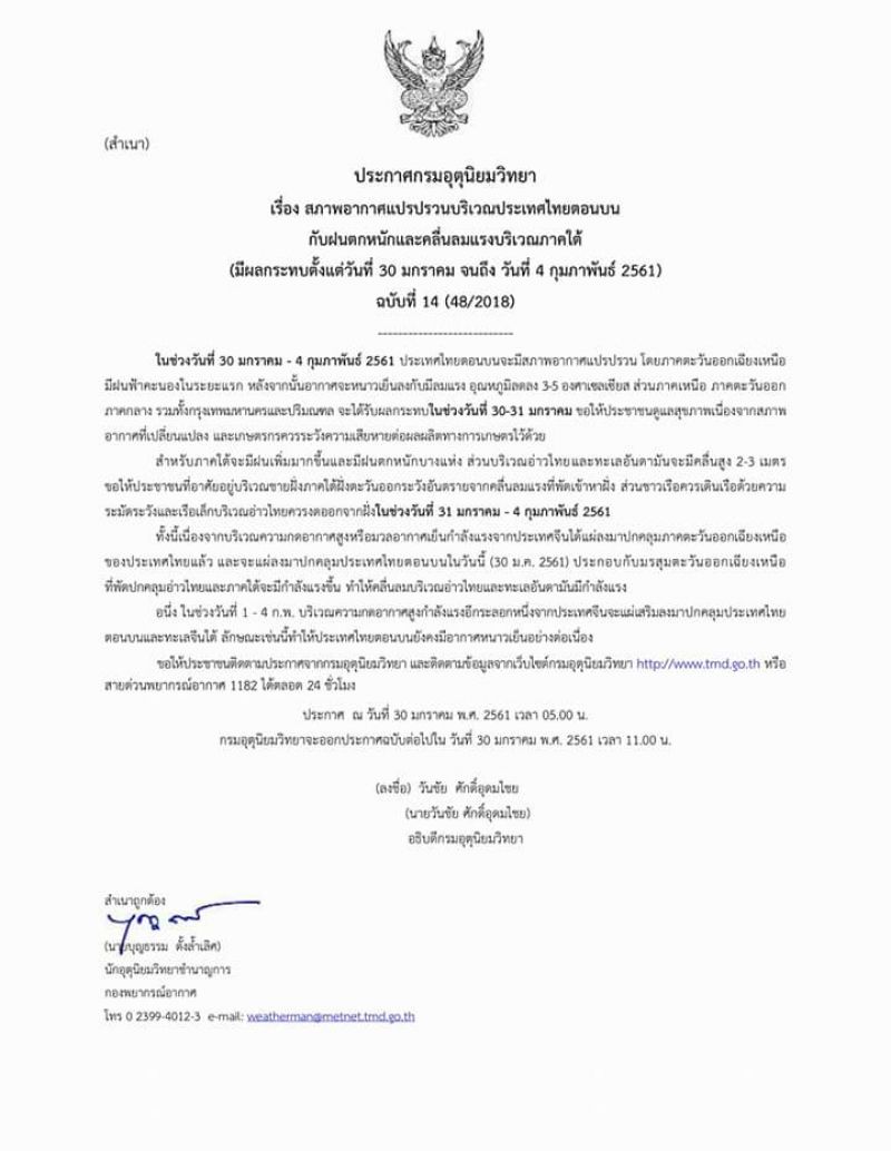 "สภาพอากาศแปรปรวนบริเวณประเทศไทยตอนบน กับฝนตกหนักและคลื่นลมแรงบริเวณภาคใต้ (มีผลกระทบตั้งแต่วันที่ 30 มกราคม จนถึง วันที่ 4 กุมภาพันธ์ 2561) "