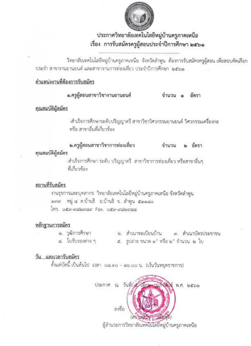 รับสมัครครูท่องเที่ยว และครูยานยนต์ รวม3ตำแหน่ง @เทคโนหมู่บ้านครู ลำพูน