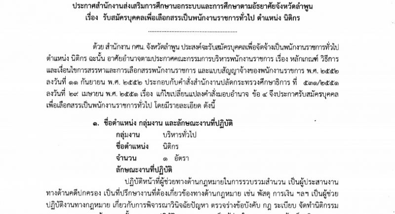 ประกาศสำนักงานส่งเสริมการศึกษานอกระบบและการศึกษาตามอัธยาศัยจังหวัดลำพูน เรื่อง รับสมัครบุคคลเพื่อเลือกสรรเป็นพนักงานราชการทั่วไป ตำแหน่ง นิติกร  จำนวน 1 อัตรา รายละเอียดดังนี้