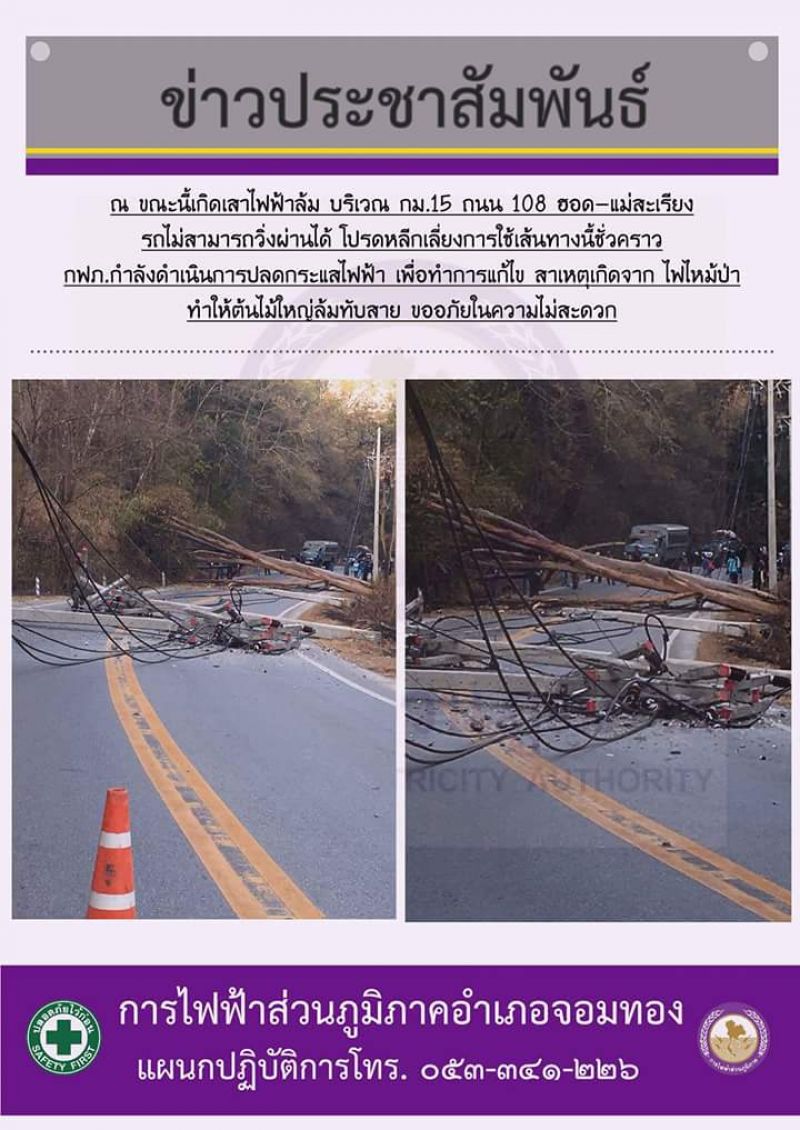 ขณะนี้มีต้นไม้ขนาดใหญ่และเสาไฟฟ้าล้มขวางถนนสายฮอดแม่สะเรียง กม.105(กม.15เดิม)รถทุกชนิดไม่สามารถสัญจรได้ขณะนี้มีรถติดเป็นทางยาว เจ้าหน้าที่การไฟฟ้าอยู่ระหว่างเร่งแก้ไข