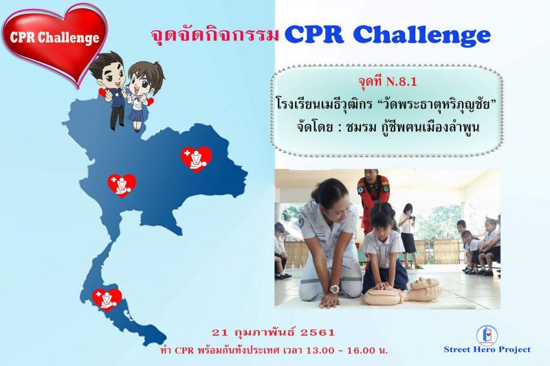 ขอร่วมกับเพจ Street Hero Project กับกิจกรรม CPR พร้อมกันทั้ง 77 จังหวัด #สร้างสถิติการทำCPR มากที่สุดในประเทศ 21 กุมภาพันธ์ 2561 ตั้งแต่ 13.00 น. -16.00 น.