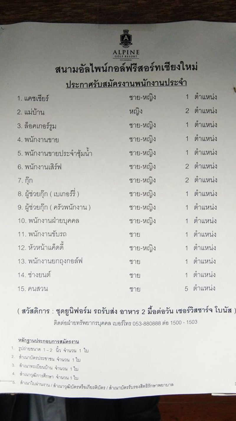 สนามกอล์ฟอัลไพน์ฯ รับสมัครงานจำนวนมาก