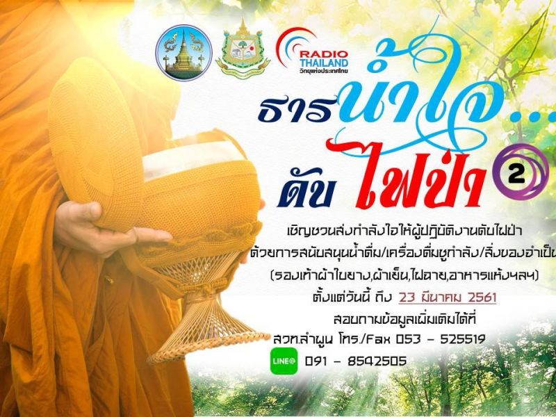 นักรบดับไฟ “กำลังใจ” คือสิ่งสำคัญ เชิญชวนทุกภาคส่วนร่วมส่งกำลังใจให้กับผู้ปฏิบัติงานดับไฟป่า ด้วยการสนับสนุนน้ำดื่ม เครื่องดื่ม เครื่องดื่มชูกำลัง หรือ สิ่งของจำเป็นสำหรับการปฏิบัติหน้าที่ (รองเท้าผ้าใบยาง,ผ้าเย็น,ไฟฉาย,ถ่ายไฟฉาย,ถุงมือ เป็นต้น) และร่วมทำบุญตักบาตร “ธารน้ำใจดับไฟป่า ปี 2” พระสงฆ์ 11 รูป ในวันเสาร์ ที่ 24 มีนาคม 2561 ณ วัดรมณียาราม (กู่ระมัก) ต.ต้นธง อ.เมืองลำพูน จ.ลำพูน เวลา 07.00 น. สิ่งของทั้งหมดประเคนถวายแด่พระภิกษุสงฆ์ เมื่อพระสงฆ์อนุโมทนาแล้ว จะมีการส่งต่อธารน้ำใจให้แก่ผู้ปฏิบัติหน้าที่ดับไฟในพื้นที่จริงต่อไป และภาพข้างล่างนี้ คือธารน้ำ ใจของคนลำพูนส่งต่อไปยังเสือไฟผู้คอยดับไฟป่าโดยผ่านทาง สวท.ลำพูน