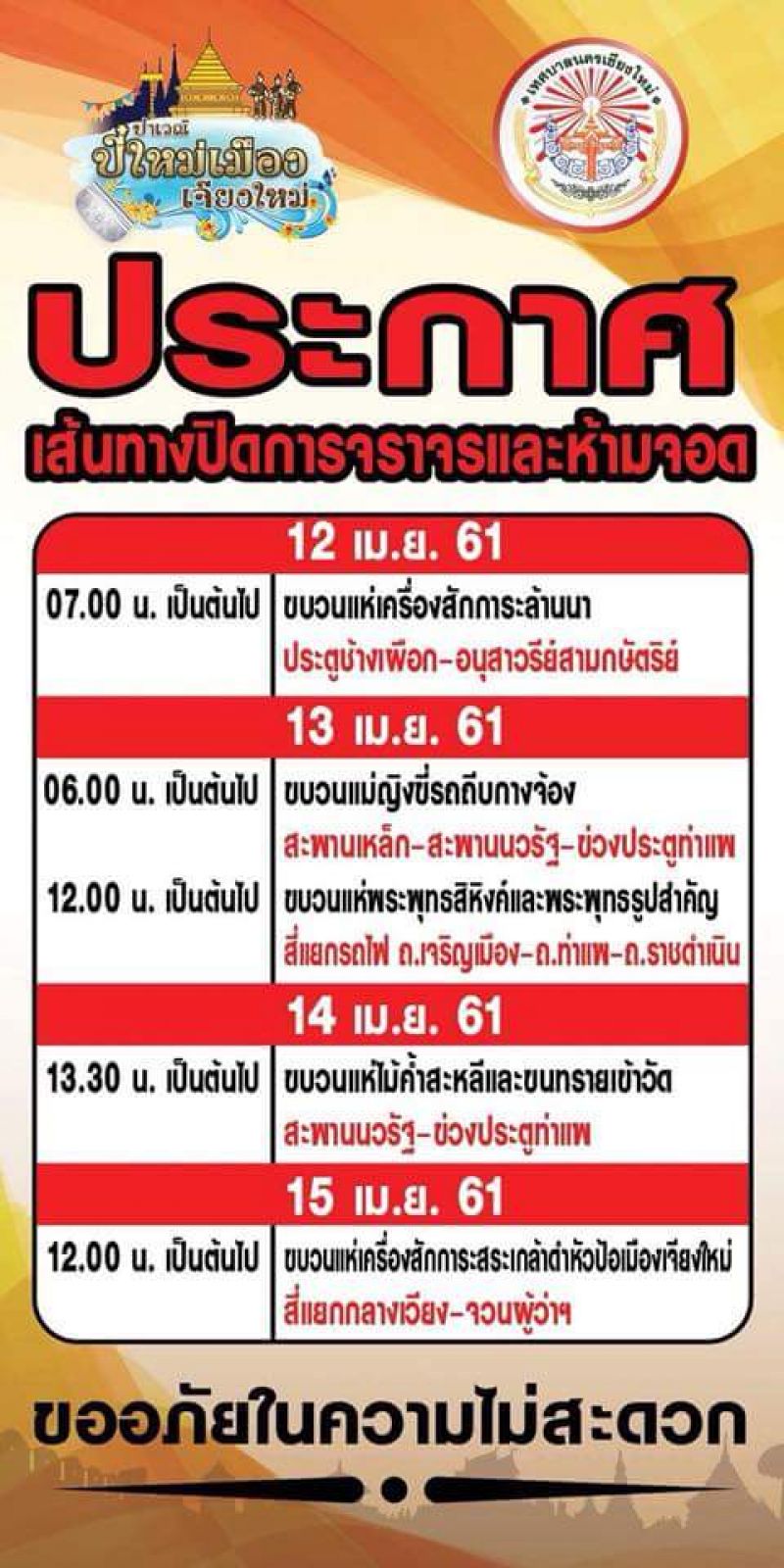 #ประชาสัมพันธ์และฝากแชร์ครับ รวมประกาศคำสั่งเจ้าพนักงานจราจรจังหวัดเชียงใหม่ ช่วงระหว่างวันที่11-17 เมษายน2561 ในตัวเมืองเชียงใหม่ #เป็นข้อมูลในการวางแผนการเดินทางหรือหลีกเลี่ยงเส้นทางครับ