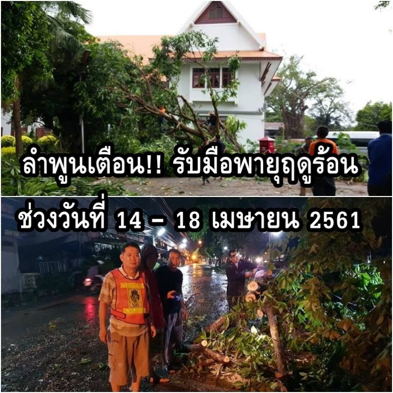 นายอรรษิษฐ์ สัมพันธรัตน์ ผู้ว่าราชการจังหวัดลำพูน เปิดเผยว่า เนื่องจากการติดตามสภาวะอากาศและพิจารณาปัจจัยเสี่ยงต่างๆ เชิงพื้นที่จากข้อมูลของหน่วยงานที่เกี่ยวข้องและประกาศของกรมอุตุนิยมวิทยา จะมีพายุฤดูร้อนเกิดขึ้นในพื้นที่ประเทศไทยตอนบน ในช่วงวันที่ 14 – 18 เมษายน 2561 โดยมีลักษณะของพายุฝนฟ้าคะนองและลมกระโชกแรง กับมีลูกเห็บตกบางพื้นที่ โดยเฉพาะพื้นที่ภาคเหนือ 16 จังหวัดให้เตรียมความพร้อมรับมือกับสถานการณ์ดังกล่าว
