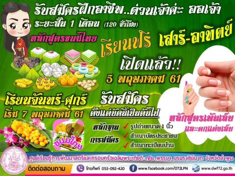 เรียนฟรี เสาร์-อาทิตย์ หลักสูตรขนมไทย/หลักสูตรเพ้นเล็บและตกแต่งเล็บ เริ่มวันที่ 5 พ.ค. 61 เรียนจันทร์-ศุกร์ หลักสูตรขนมไทย เริ่มวันที่ 7 พ.ค. 61 ติดต่อสอบถามรายละเอียดโทร 053-092420 ต่อ 24