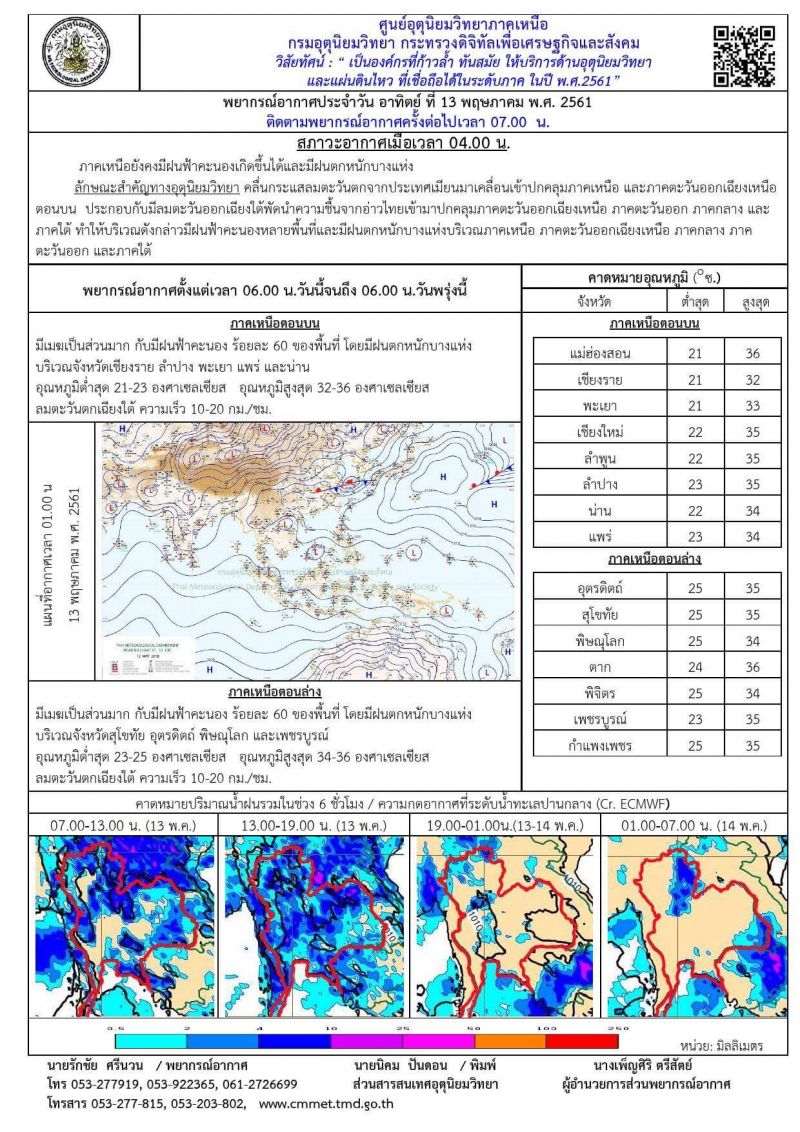 พยากรณ์อากาศ ประจำวันที่ 13 พ.ค. 2561 วันนี้ภาคเหนือตอนบนยังมีฝนฟ้าคะนอง ส่วนมากจังหวัดเชียงรายลำปางแพร่น่าน