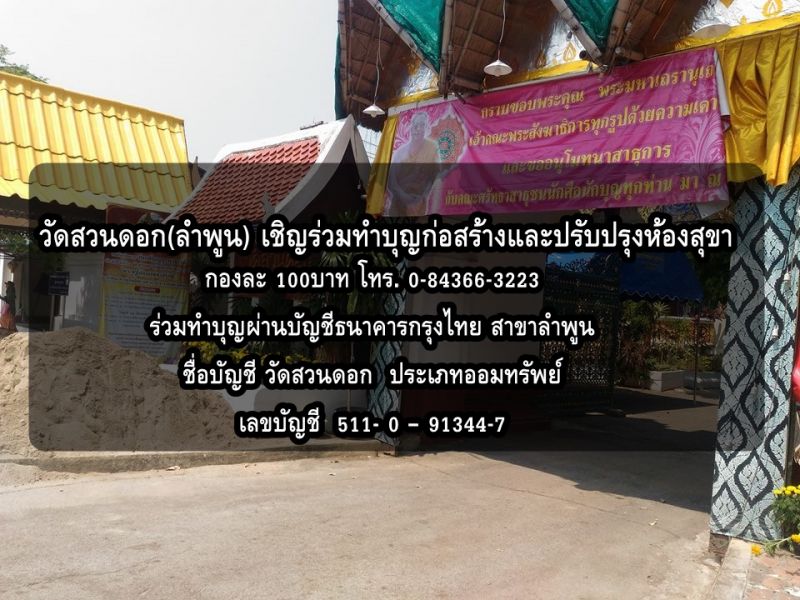 | • วัดสวนดอก(ลำพูน) เชิญร่วมทำบุญก่อสร้างและปรับปรุงห้องสุขา กองละ 100บาท |