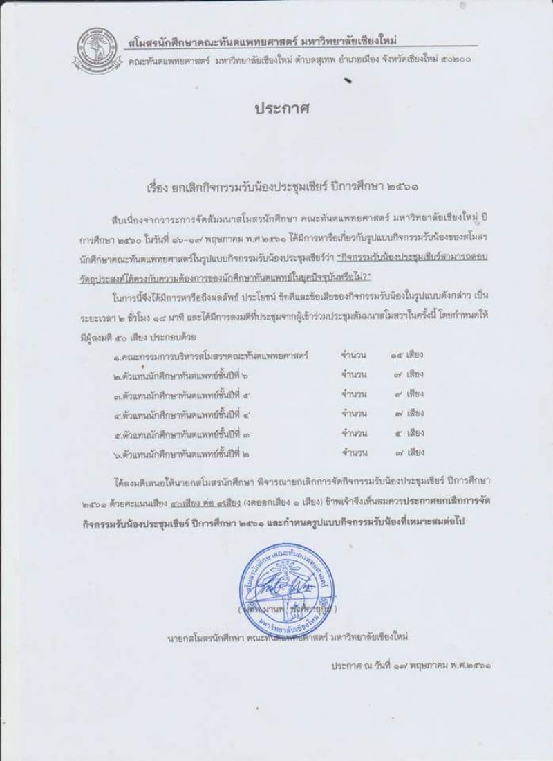 คณะทันตแพทย์ มช.ประกาศยกเลิกกิจกรรมรับน้องประชุมเชียร์ ปีการศึกษา 2561