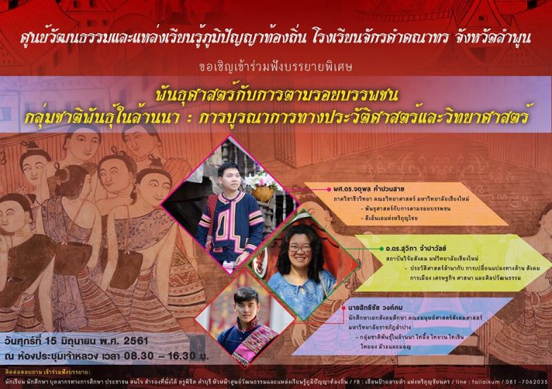 ศูนย์วัฒนธรรมและงานแหล่งเรียนรู้ภูมิปัญญาท้องถิ่น โรงเรียนจักรคำคณาทร จังหวัดลำพูน ขอเชิญ นักเรียน นักศึกษา บุคลากรทางการศึกษา ประชาชน ที่สนใจ เข้าร่วมฟังบรรยายพิเศษในหัวข้อ " พันธุศาสตร์กับการตามรอยบรรพชน กลุ่มชาติพันธุ์ในล้านนา : การบูรณาการทางประวัติศาสตร์และวิทยาศาสตร์" วันที่ 15 มิถุนายน 2561 ณ ห้องประชุมเจ้าหลวง