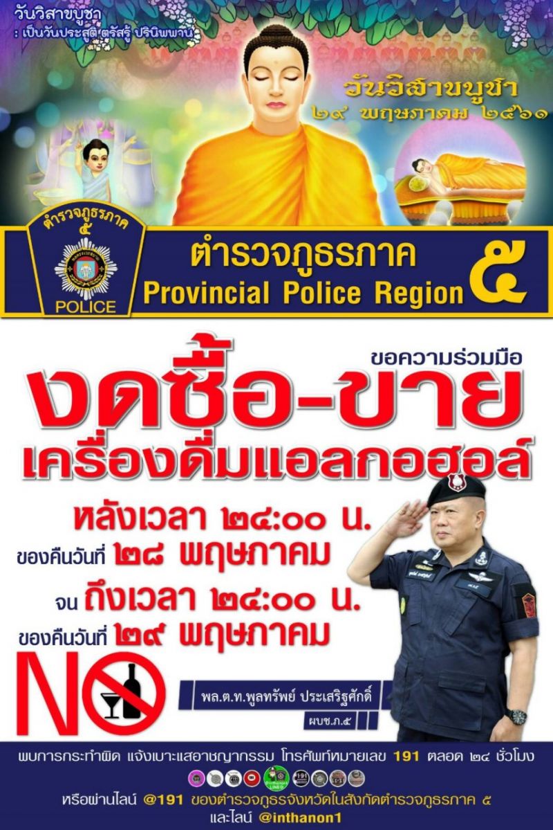งดซื้อ-ขาย เครื่องดื่มแอลกอฮอล์ ในวันวิสาขบูชา เที่ยงคืน 28พ.ค.- เที่ยคืน 29พค.61