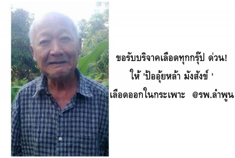 ขอรับบริจาคเลือดทุกกรุ๊ป ด่วน! ให้ 'ป้ออุ้ยหล้า มังสังข์ ' เลือดออกในกระเพาะ @รพ.ลำพูน #โปรดแชร์
