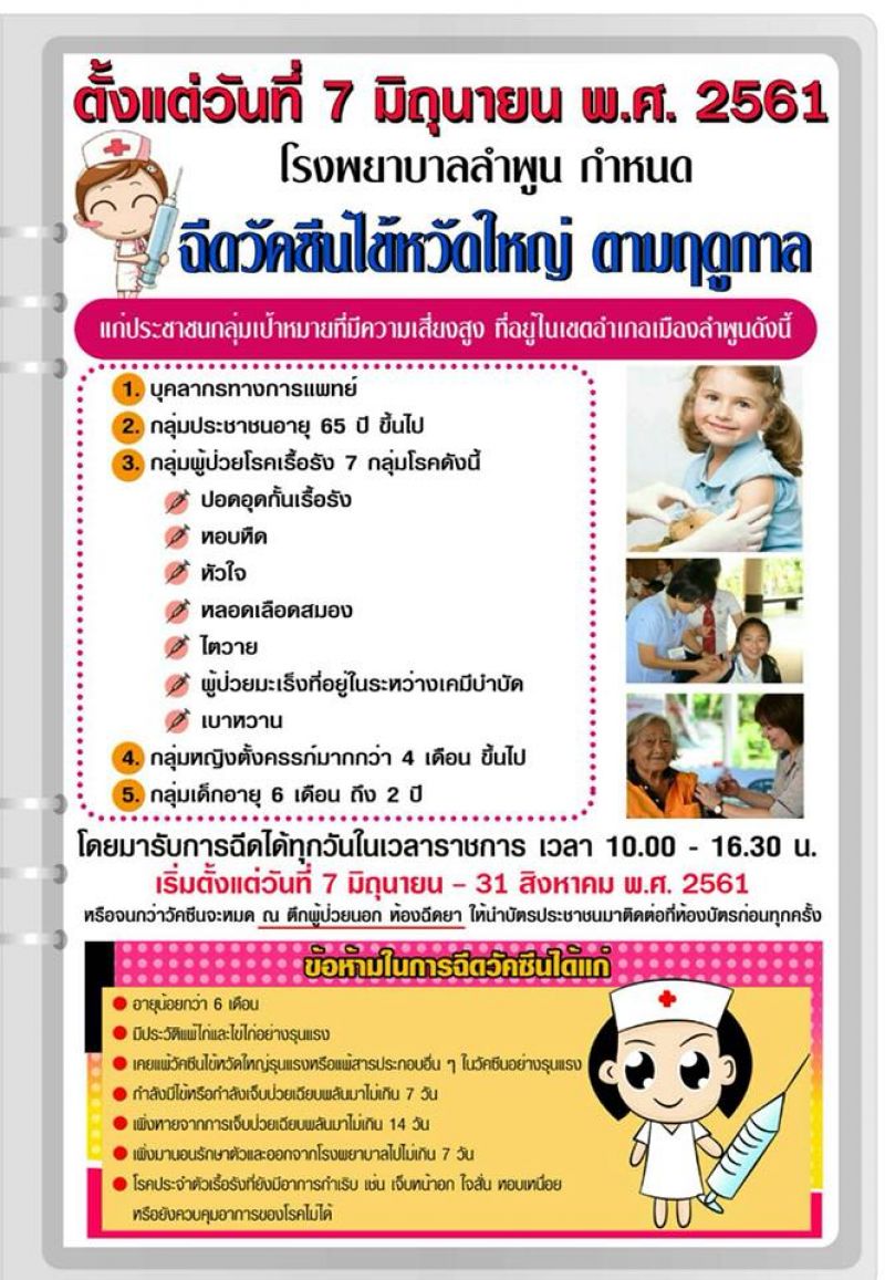 กำหนดฉีดวัคซีนไข้หวัดใหญ่ตามฤดูกาล โรงพยาบาลลำพูน ประจำปี 2561  ในเขตอำเภอเมือง