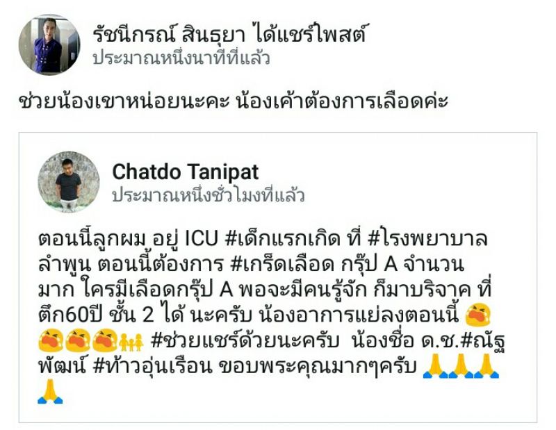วันนี้ได้รับข้อความ จากสมาชิกกลุ่มฮาลำพูน ได้แชร์โพสต์ เป็นการขอรับบริจาคเลือดให้กับเด็กแรกเกิด โดยมีรายละเอียดดังนี้