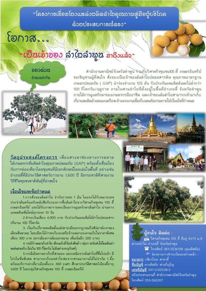 สำนักงานพาณิชย์จังหวัดลำพูน ร่วมกับวิสาหกิจชุมชน105 ลี้ เกษตรอินทรีย์ ขอเชิญชวนผู้ที่สนใจ สั่งจองเป็นเจ้าของต้นลำไยปลอดสารพิษ คุณภาพมาตรฐานเกษตรปลอดภัย ( GAP) รับประกันผลผลิตต้นละไม่ต่ำกว่า 100 กิโลกรัม/ฤดูกาล ภายในสวนลำไยที่ตั้งอยู่ในพื้นที่อำเภอลี้ จังหวัดลำพูน ภายใต้การดูแลรักษาของเกษตรกรมืออาชีพ และเจ้าของต้นลำไยสามารถเข้ามาเก็บเกี่ยวผลผลิตด้วยตนเองหรือจะจ้างแรงงานเพื่อเก็บและคัดเกรดภายใต้เงื่อนไขที่กำหนด