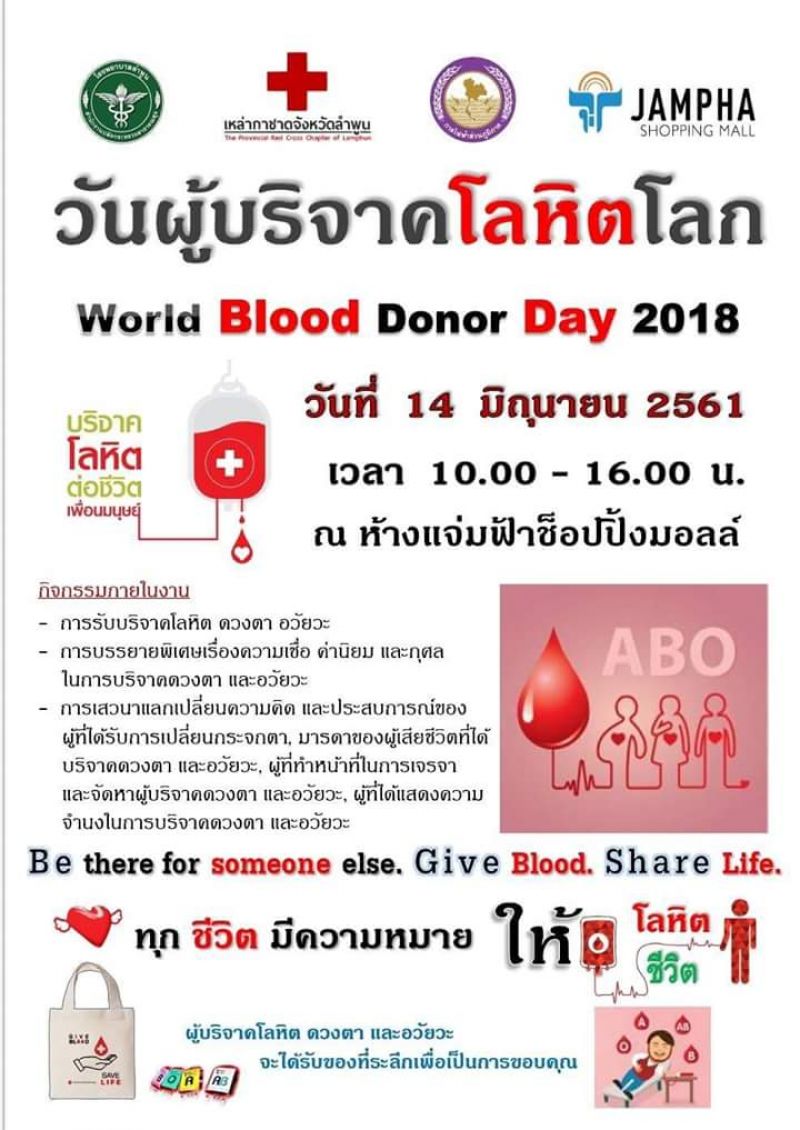 เชิญร่วมบริจาคเลือด @แจ่มฟ้า(ลำพูน) 14มิ.ย.61 เวลา 10.00-16.00น. #วันผู้บริจาคโลหิตโลก