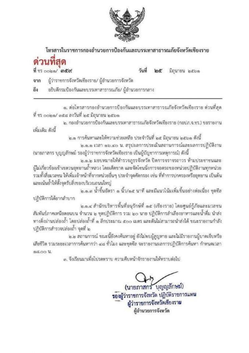 22.50 น.รองผู้ว่าราชการจังหวัดเชียงราย มีคําสั่งปิดการจราจร พร้อมกับห้ามประชาชน และผู้ไม่มีส่วนเกี่ยวข้อง เข้าเขตวนอุทยานถ้ำหลวงโดยเด็ดขาด เพื่อความสะดวกของเจ้าหน้าที่ในการปฏิบัติงานค้นหาน้อง ๆ ทั้ง 13 ชีวิตที่ติดอยู่ภายในถํ้าหลวงขุ่นนํ้านางนอน