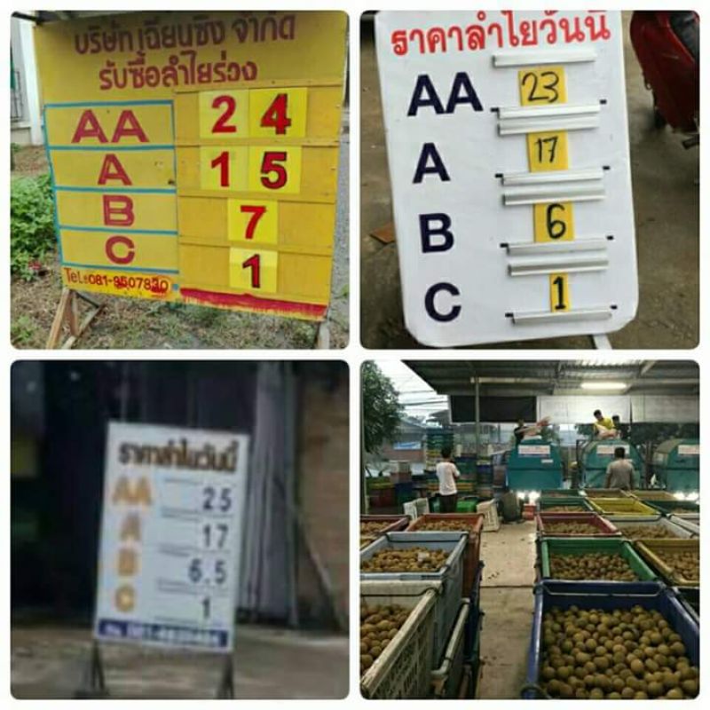 ลำไยสด (พ่าย) ส่งออก ราคารับซื้อเกรด AA+A = 22-25 บาท/กก. ราคาทรงตัวต่อเนื่อง