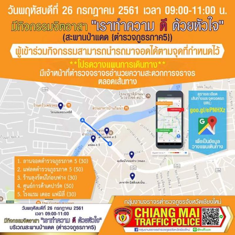 พรุ่งนี้วันพฤหัสบดีที่ 26กรกฎาคม 2561 ช่วงเวลา 09.00-11.00น.จะการส่งมอบพื้นที่การดำเนินการโครงการ”จิตอาสาพัฒนาปรับภูมิทัศน์สะพานป่าแดดภาค5 พัฒนาถนนมหิดลและถนนสนามบิน” ตามแนวพระราชดำริ “เราทำความดี ด้วยหัวใจ”