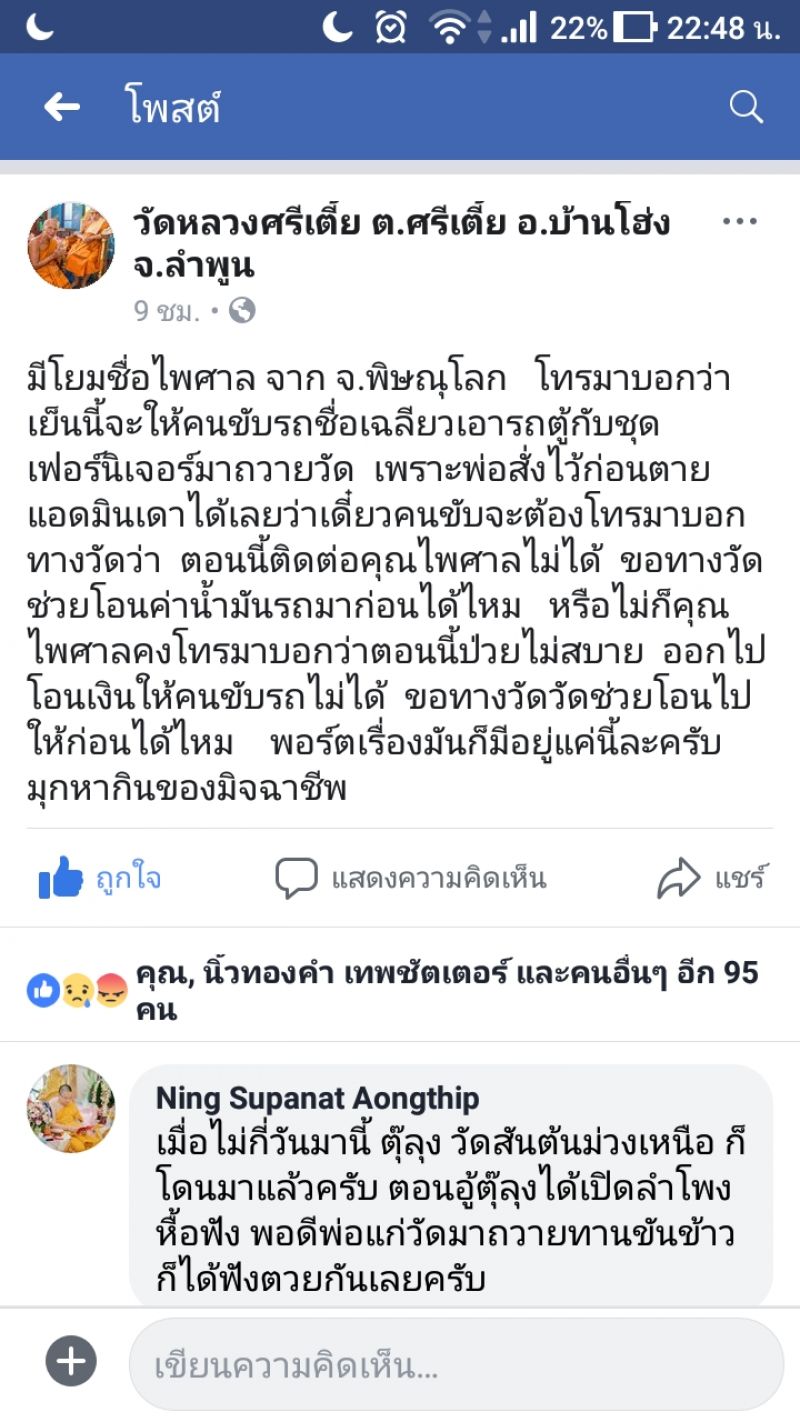 มีโยมชื่อไพศาล จาก จ.พิษณุโลก โทรมาบอกว่าเย็นนี้จะให้คนขับรถชื่อเฉลียวเอารถตู้กับชุดเฟอร์นิเจอร์มาถวายวัด เพราะพ่อสั่งไว้ก่อนตาย แอดมินเดาได้เลยว่าเดี๋ยวคนขับจะต้องโทรมาบอกทางวัดว่า ตอนนี้ติดต่อคุณไพศาลไม่ได้ ขอทางวัดช่วยโอนค่าน้ำมันรถมาก่อนได้ไหม หรือไม่ก็คุณไพศาลคงโทรมาบอกว่าตอนนี้ป่วยไม่สบาย ออกไปโอนเงินให้คนขับรถไม่ได้ ขอทางวัดวัดช่วยโอนไปให้ก่อนได้ไหม พอร์ตเรื่องมันก็มีอยู่แค่นี้ละครับ มุกหากินของมิจฉาชีพ
