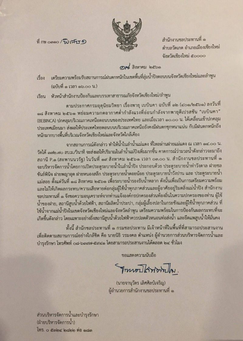 สำนักชลประทานที่1ยืนยัน น้ำปิงไม่ล้นตลิ่งท่วมตัวเมืองเชียงใหม่แน่ แม้มวลน้ำสูงสุดจะมาถึงตัวเมืองที่ P.1ประมาณ 03.00 น. ปริมาณ 300-350 ลูกบาศก์เมตร/วินาที ขณะที่ลำน้ำช่วงผ่านเมืองรับได้สูงสุดถึง 450 ลบ.ม./วินาที