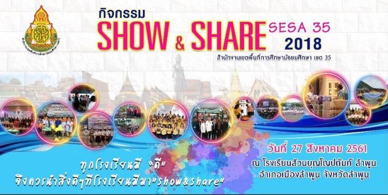 ขออนุญาตประชาสัมพันธ์ กิจกรรม show & share Sesa 35  2018 กิจกรรมของนักเรียนโรงเรียนสังกัด สพม.35 ลำพูน -ลำปาง แต่ละโรงเรียนจะได้นำกิจกรรมดีๆ และกิจกรรมเด่นของแต่ละโรงเรียนมานำเสนอ ชวนชวนพี่น้องชาวลำพูนที่ว่างจากงาน รับชมผลงานนักเรียนได้ที่โรงเรียนส่วนบุญโญปถัมภ์ ลำพูน ตามกำหนดการต่อไปนี้