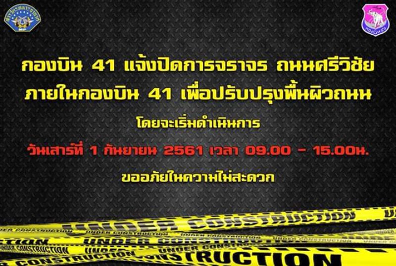กองบิน41 แจ้งปิดการจราจรถนนศรีวิชัย ภายในกองบิน41 เพื่อปรับปรุงพื้นผิวการจราจรโดยจะเริ่มดำเนินการในวันเสาร์ที่ 1 กันยายน 2561 เวลา 09.00-15.00น