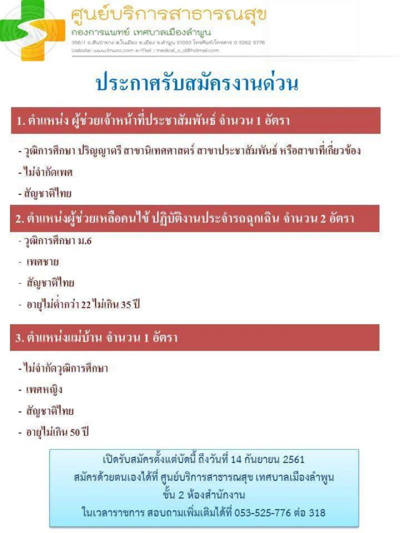 เทศบาลเมืองลำพูน รับสมัครงานด่วน!!!