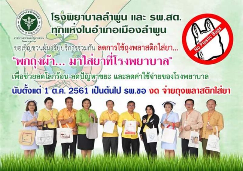 แจ้งให้ทราบ วันที่ 1 ตุลาคม 2561 โรงพยาบาลลำพูนและ รพ.สต. ทุกแห่งในอำเภอเมืองลำพูนจะงด จ่ายถุงพลาสติกใส่ยาขอให้พี่น้องประชาชนนำถุงผ้า หรืออื่นๆเพื่อมาใส่ยาของตน และยังเชิญชวนพี่น้องประชาชนร่วมบริจาคถุงผ้าเพื่อใช้ในการใส่ยา