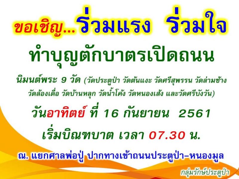 กลุ่มรักษ์ประตูป่า เชิญตักบาตรเปิดถนน ประตูป่า-จักรคำ วันที่ 16ก.ย.61 07.30น.