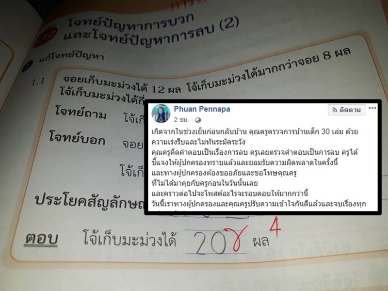 "เกิดจากในช่วงเย็นก่อนกลับบ้าน คุณครูตรวจการบ้านเด็ก 30 เล่ม ด้วยความเร่งรีบและไม่ทันระมัดระวัง คุณครูคิดคำตอบเป็นเรื่องการลบ ครูเลยตรวจคำตอบเป็นการลบ ครูได้ชี้แจงให้ผู้ปกครองทราบแล้วและยอมรับความผิดพลาดในครั้งนี้ และทางผู้ปกครองต้องขออภัยและขอโทษคุณครู ที่ไม่ได้มาคุยกับครูก่อนในวันนั้นเลย และคราวต่อไปจะโพสต์อะไรจะรอบคอบให้มากกว่านี้ วันนี้เราทางผู้ปกครองและคุณครูปรับความเข้าใจกันดีแล้วและจบเรื่องทุกอย่างแล้วค่ะ"