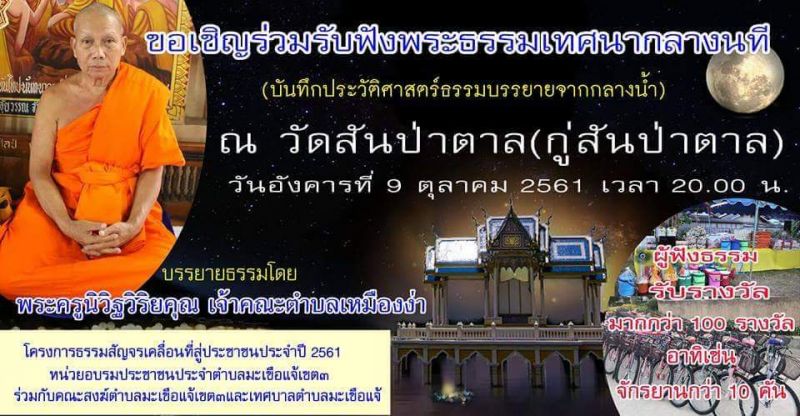 เชิญร่วมฟังธรรม แล้วลุ้นรับ รถถีบ 10คัน แะของรางวัลกว่า100รางวัล 9 ตุลาคมนี้ ณ วัดสันป่าตาล(กู่สันป่าตาล) ต.เหมืองง่า จ.ลำพูน
