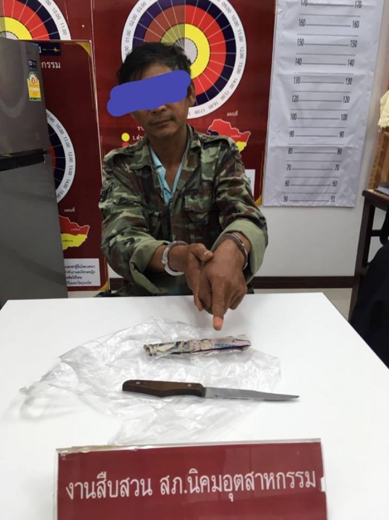 6. พฤติการณ์ สืบเนื่องจากเมื่อวันที่ (๔ /ต.ค./๖๑) เวลาประมาณ ๒๑.๓๐ น. พงส.สภ.นิคมฯ และชุดจับกุมได้รับแจ้งจากศูนย์วิทยุ สภ.นิคม ฯ ว่ามีเหตุทำร้ายร่างกายโดยใช้อาวุธมีด ที่บ้านเช่าในสวนลำไยไม่มีเลขที่ บ้านจำขี้มด ม.๒ ต.ศรีบัวบาน อ.เมือง จ.ลำพูน เมื่อได้รับแจ้งจึงได้ร่วมกันไปตรวจสอบที่เกิดเหตุ เมื่อไปถึงพบ นายชวลิต บุญอุปาละ ผู้ใหญ่บ้าน ม.๒ อยู่บริเวณหน้าบ้านเช่าที่เกิดเหตุ สอบถามนายชวลิตฯ ให้การว่า ได้มีนายอนุสรณ์ คนงานก่อสร้างหลังศาลากลางใหม่ จว.ลำพูน ที่มาพักอาศัยอยู่บ้านเช่าที่เกิดเหตุ ถูกแทงด้วยอาวุธมีดปลอกผลไม้ จำนวน ๒ แผล ที่บริเวณหัวไหล่ด้านซ้ายและท้องด้านขวา ถูกนำตัวส่ง รพ.ลำพูน และตรวจค้นพบของกลางตกอยู่บริเวณที่เกิดเหตุ พงสฯ และ เจ้าหน้าที่สืบสวนชุดจับกุมจึงสอบถามกับ นายชวลิตฯ ผู้ใหญ่บ้าน ม.๒ ทราบว่าผู้ก่อเหตุ คือ นายสุรศักดิ์ หรือเอ็ม อายุ ๔๖ ปี ที่ทำงานเดียวกันกับผู้ถูกแทง และได้พักอาศัยอยู่ในบ้านพักที่เกิดเหตุเดียวกัน ได้หลบหนีไปทางสวนลำไยด้านหลังบ้านเช่าที่เกิดเหตุ ซึ่งไม่มีแสงสว่าง เจ้าหน้าที่ชุดสืบสวนจึงได้แยกกำลังกันออกค้นหา นายสุรศักดิ์ฯ ในพื้นที่สวนลำไยหลังบ้านและบริเวณใกล้เคียงที่คาดว่านายสุรศักดิ์ฯ ใช้หลบซ่อนตัวอย่างต่อเนื่องจนกระทั่งรุ่งเช้าของวันที่ ๕ ต.ค. ๖๑ เวลาประมาณ ๐๘.๒๐ น.เจ้าหน้าที่ชุดจับกุมได้รับแจ้ง จากนายชวลิตฯ ผู้ใหญ่บ้าน ม.๒ ว่า ได้พบเห็นนายสุรศักดิ์ฯ กลับเข้ามาที่บ้านเช่าที่เกิดเหตุเพื่อเข้ามาเก็บสัมภาระส่วนตัวเพื่อที่จะหลบหนีและได้เดินออกจากบ้านเช่า ไปทางถนนชุปเปอร์ไฮเวย์ เชียงใหม่-ลำปาง เจ้าหน้าที่ชุดจับกุมจึงได้ขับรถออกติดตาม ตามที่ได้รับแจ้ง เมื่อมาถึงบริเวณที่จับกุมพบ นายสุรศักดิ์ฯ หิ้วกระเป๋าสัมภาระเดินมาตามถนน เจ้าหน้าที่ชุดจับกุมจึงแสดงตัวเป็นเจ้าหน้าที่ตำรวจ และได้เข้าควบคุมตัวนายสุรศักดิ์ฯ จากนั้นได้สอบถาม นายสุรศักดิ์ฯ ว่าเป็นบุคคลเดียวกันกับผู้ก่อเหตุใช้อาวุธมีดแทง นายอนุสรณ์ คนหลวง หรือไม่ นายสุรศักดิ์ฯ ให้การรับสารภาพว่าเป็นบุคคลเดียวกัน โดยได้ก่อเหตุใช้มีดปลอกผลไม้แทงนายอนุสรณ์ฯ จำนวน ๒ แผล ที่บริเวณหัวไหล่ซ้ายและบริเวณท้องด้านขวา เมื่อวันที่ ๔ ต.ค. ๖๑ เวลาประมาณ ๑๘.๓๐ น. ที่บ้านเช่าที่เกิดเหตุ จริง ดังนั้นเจ้าหน้าที่ชุดจับกุมจึงได้เชิญตัวนายสุรศักดิ์ฯ มาที่ สภ.นิคมอุตสาหกรรม ลำพูน พร้อมกับแจ้งข้อกล่าวหาให้นายสุรศักดิ์ฯ ทราบ นำตัวพร้อมของกลางส่ง พงส. สภ.นิคมฯ เพื่อดำเนินคดีตามกฎหมายต่อไป